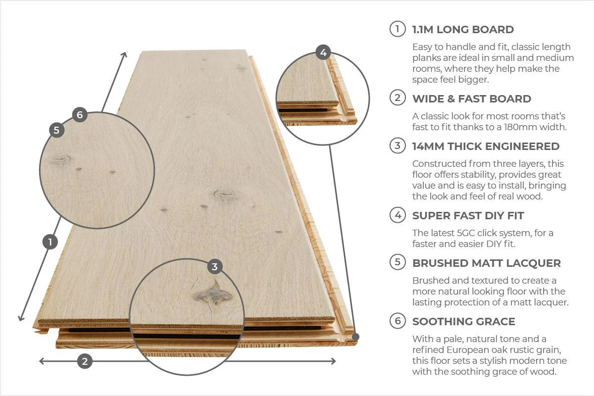 Home Choice Engineered European Rustic Oak Flooring 14mm x 180mm Alabaster Lacquered is also incredibly easy to care for, offering great durability and stain resistance thanks to its matt lacquer coating. The wide, classic-length boards come in a fixed size (180mm x 1100mm) to create a consistent, uniform look that works brilliantly in most rooms. With a standard 2.5mm hardwood wear layer, a tough engineered three-layer construction and a 5GC click-together joint system for fast and easy DIY installation on top of underlay, this floor is suitable for use throughout the home.